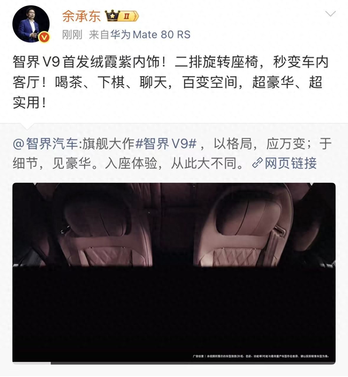 2月5日,鸿蒙智行首款旗舰9系MPV智界V9内饰视频正式公布,官宣“绒霞紫”专属内饰配色与“辉光紫”外观命名。这款鸿蒙智行又一高端力作,凭借二排旋转座椅、双零重力座椅等百万级豪华配置,以及媲美顶级豪车的工艺用料,颠覆市场对高端MPV的传统认知,以“MPV科技车皇”的硬核产品力,为用户勾勒出未来智能豪华出行的全新图景。